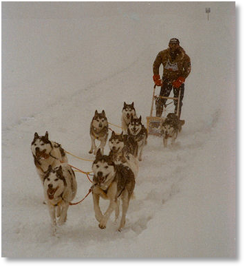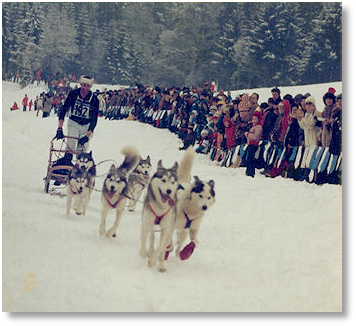 Peter Thomann (Switzerland) took the sport and the European race scene by storm in many ways. He ran a very good team. Breeding Kaltag of Kolyma, his stud fee pup out of Alaskan’s Pala of Anadyr and our Vanessa of Kolyma, caused quite an upheaval, as Kaltag was a monorchid (one testicle), which officially was not allowed by the Swiss Kennelclub for breeding. Consequently there were no official AKC pedigrees for Kaltag’s offspring. At a later stage veterinarians concluded that his second testicle had descended low enough in its canal to allow his offspring pedigrees after all, so that was corrected. Pala (the pinto running lead here in the first photo) was a first-string dog in Earl Norris’ team, so why he decided to breed Kaltag (the grey dog running in lead in the colour photo), we never understood. Peter Thomann emigrated to Alaska with all his dogs in the end.