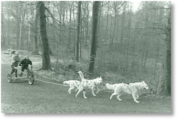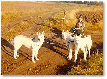 Grethe Westring (Denmark) was the absolute pioneer in Denmark and Central Europe for the Siberian Husky breed. Initially she had exclusively pure white dogs, which reproduced predominantly that colour when bred, but slowly grey and black & white dogs began to emerge in her litters. We came in contact in those early days, but Denmark still had strict quarantine regulations in place, so interaction with dogs was not easy. However, Grethe really started to promote the Siberian as a working sled dog and generated a lot of publicity on TV and in the press, putting her dogs in front of a small cart and giving demonstrations at dog shows. She soon caught the attention of Axel Vermehren (Yokon Kennels), who bought his first dogs from her. Luckily Denmark was the first Scandinavian country to abolished those quarantine restriction and the other Scandinavian countries followed shortly after, and this enabled the Danish breeders and mushers to participate in the Central European sled dog sport.