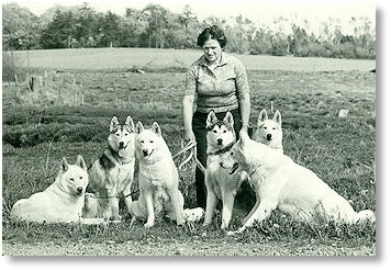 She started with a female, Finnmarka's Jaki out off Rose Andersen’s litter (with Sire and Dam both going back to Alaskan’s Astro of Anadyr) and imported Kuchin Darky, a male from Chris Camping’s Kuchin Kennels in 1976. She used our Vostok of Kolyma twice for her females and when we closed our kennel we gave our two best females - Liberty of Kolyma and Emily of Kolyma, together with Gyp of Kolyma & Zurcko of Kolyma - to her, from which she bred some very good litters.
