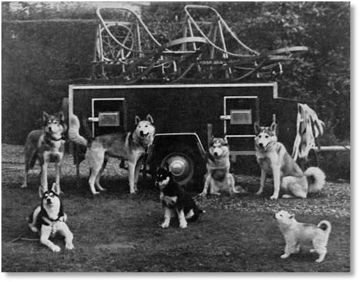 From left to right, below: Alaskans... Arnak, Ch. Sascha (Blackey) & Mishonak (Whitey) of Anadyr.