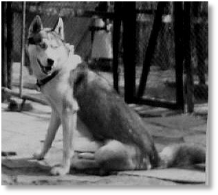Chatka compensated well for Silver’s somewhat loose coat structure, as her’s was wonderfully soft and dense. Her specific exterior traits you will find on the V-litter and Our Anadyr Dogs pages. She had a rare blue-grey colouring and her eyes had that same colour - I’ve never seen that colour combination since and sadly enough she never passed it on in her offspring, as far as I know. The hilarious thing with Chatka was that she started to forget that she had decided to be shy and became a very happy dog. But every now and then she remembered. You could call out to her then: “Oh, come on silly girl... you have forgotten it, remember?” and then you saw her thinking “Oh well, what the heck...” and she would come up to you to be petted. She truly had a sense of humour, you could really laugh with her and that trait she did pass on to her pups!
